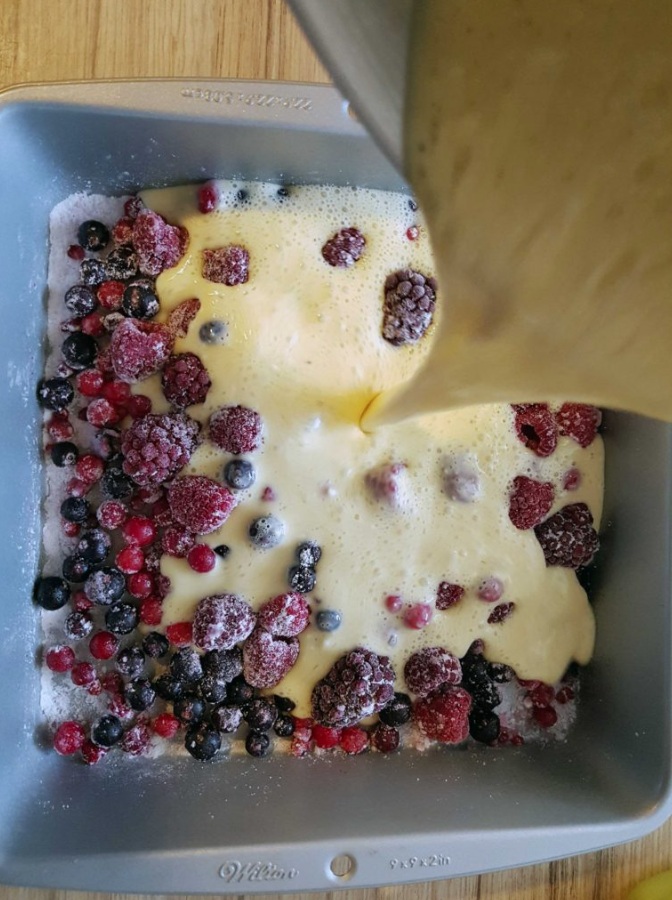 Zgrabi porcijo jagodičevja, sladkor, mleko, maslo, moko, jajca in vanilijo ter speci kolač, ki ima svoje korenine v francoskem kolaču clafoutis. Slednjemu se lahko približaš še bolj tako, da uporabiš temne češnje.
