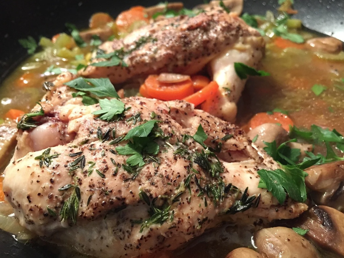 Vrnite piščančje kose v posodo, dodajte timijan in zavrite. Zmanjšajte ogenj, pokrijte in kuhajte na nizki temperaturi približno 40-50 minut, dokler piščanec ni popolnoma kuhan in meso skoraj odpada od kosti.