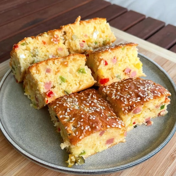 - 4 jajca - 300 g svežega sira - 180 g jogurta (ali kislo mleko) - 150 ml olja - 150 g gladke moke - 100 g koruzne moke - 1 pecilni prašek - 150 g šunke - 2 reči papriki - kisle kumarice (po želji) - sol