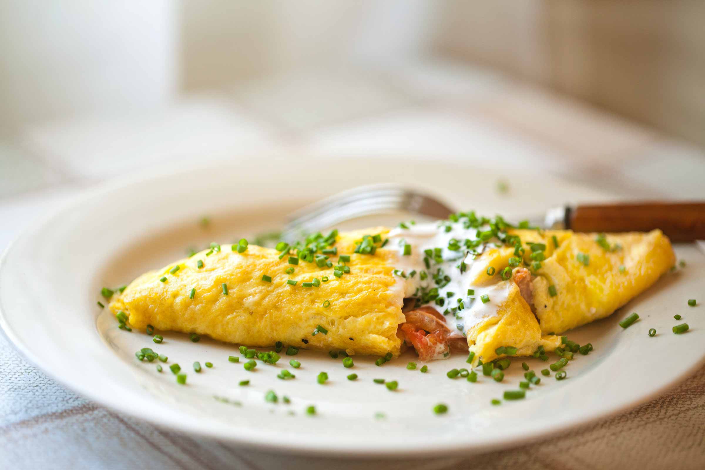 Jajčno omleto postrežemo s preostalim nasekljanim drobnjakom ter žlico kisle smetane ali creme fraiche.