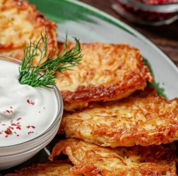 Gre za palačinke iz drobno naribanega surovega krompirja in čebule, ki so klasična ukrajinska jed, imenovana Deruny.