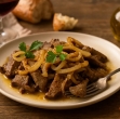 V široki ponvi razpustimo polovico masla in opečemo rezine jabolk, potem jih vzamemo iz ponve in shranimo na toplem. Na isti maščobi do zlato rjave barve prepražimo še narezano čebulo, potem jo vzamemo iz ponve in shranimo na toplem.