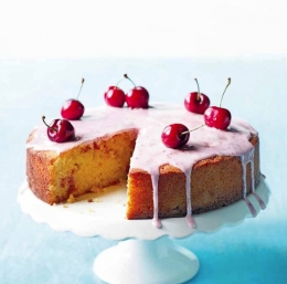 300 g grobo narezanih češenj brez koščic 250 g koruznega zdroba (polente) 250 g zmehčanega masla 250 g drobnega rjavega sladkorja 4 velika jajca 100 g zmletih mandljev 2,5 žlički pecilnega praška 1,5 dl navadnega jogurta sok ½ pomaranče češnje s peclji za okras