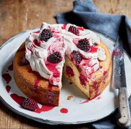 V skledo damo preostali jogurt, sladko smetano in sladkor v prahu ter vse skupaj stepemo, da dobimo rahlo kremo. Vanjo vmešamo dve žlici robidove omake, da nastane marmoriran vzorec. Kremo naložimo na biskvit, po vrhu pa jo pokapamo z malo omake in okrasimo z robidnicami. Kolač narežemo na kose in postrežemo z robidovo omako, ki nam je še ostala.