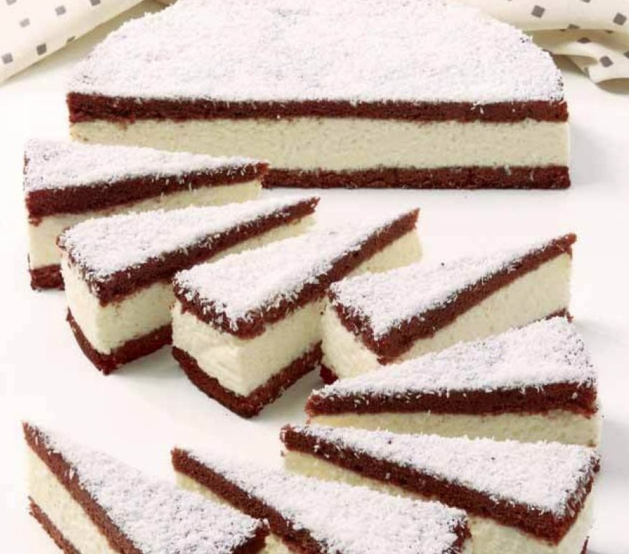 6,5 dl mleka 180 g kokosove moke (kosmičev) 90 g sladkorja 30 g škroba 6 listov želatine 1 dl kokosovega likerja 3,5 dl sladke smetane marmelada za premaz kokosova moka za posip