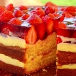 Vaniljev biskvit, posejan s pikicami maka, nadevan s pomarančno kremo in jagodami - božansko