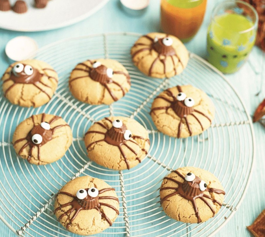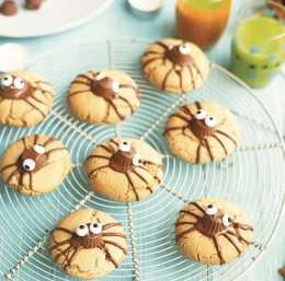 Mlečno čokolado nasekljamo in jo stopimo v mikrovalovni pečici v kratkih intervalih ali pa v parni kopeli, a le toliko, da se utekočini. Prelijemo jo v vrečko za brizganje z nastavkom z ozko odprtino (ali pa jo damo v vrečko za zamrzovanje, ki ji odrežemo čisto majhen vogalček) in pustimo, da se malo ohladi. Na vsak piškot nabrizgamo pajkove nogice.