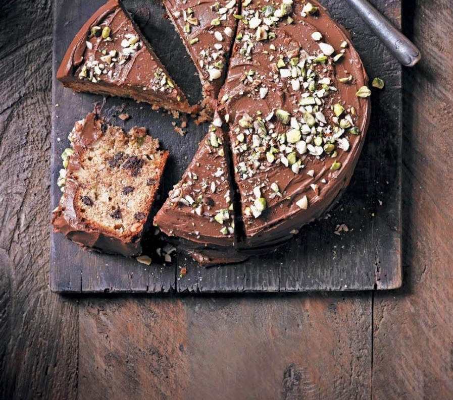250 g masla 250 g sladkorja 200 g moke 50 g polnozrnate moke 2 žlički pecilnega praška 100 g mletih mandljev 1 žlička mletega cimeta ščep mletega ingverja ščep muškatnega oreška 50 g lešnikov 50 g neolupljenih mandljev 50 g pistacij 50 g oreškov makadamije 100 g temne čokolade ali čokoladnih kapljic 3 velika jajca 1 žlička mandljeve arome 2 hruški maslo za pekač