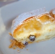 50 g rozin 2 žlici ruma 250 g manj mastne skute 100 g sladkorja v prahu 1 zavitek vaniljevega sladkorja 1 žlica jedilnega škroba 2 jajci 50 g naribanih lešnikov ščepec soli 2 lista svežega testa za zavitek 1,5 dl sladke smetane