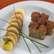 250 g telečjih pljuč 250 g telečjega srca 250 g telečjih prsi (brez kosti) voda 1 žlica kisa 1 žlička soli 200 g grobo zmletih telečjih jeter 2 žemlji od prejšnjega dne, namočeni v vodi 1 jajce ščepec zmletih nageljnovih žbic ščepec pimenta sol poper 1 žlička majarona 1 žlička bazilike 1 žlička melise 2 stroka česna, olupljena in drobno narezana maslo ali mast za model