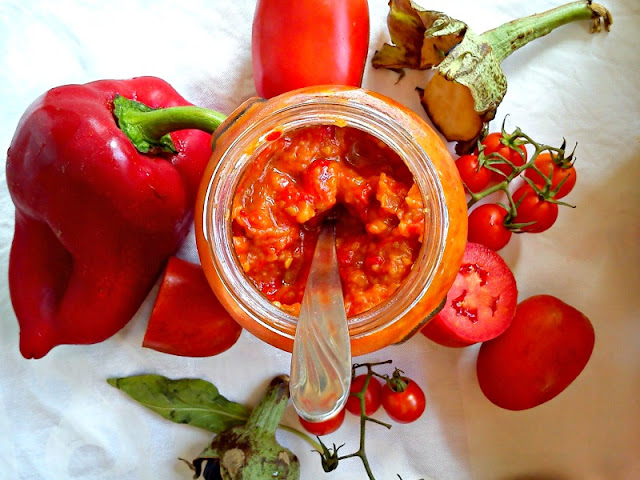 3 kg rdečih paprik, 1,5 kg zrelih paradižnikov, 2–3 jajčevci (približno 0,5 kg), 3–4 stroki česna, 100 ml sončničnega olja, 1 žlica soli, 1 žlica sladkorja, ščepec popra ali čilija (po želji).