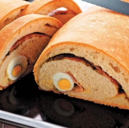 Razvaljamo ga na pomokani delovni površini v kvadrat, približno centimeter debelo. Testo obložimo s šunko, potresemo s sirom in drobno nasekljanimi zelišči, nato pa po šunki razporedimo še cela olupljena kuhana jajca ter nadevano testo zvijemo.