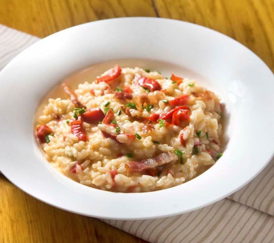 Nadaljujemo počasi z dolivanjem osnove, dokler se riž ne skuha. Medtem v drugi ponvi na oljčnem olju hrustljavo prepražimo panceto. Ko je riž kuhan, vanj vmešamo panceto, preostalo papriko, peteršilj, sir maskarpone in sveže nariban parmezan. Premešamo, pokrijemo in počakamo 3 minute, da se okusi prepojijo. Preden rižoto postrežemo, jo potresemo z narezanim drobnjakom.