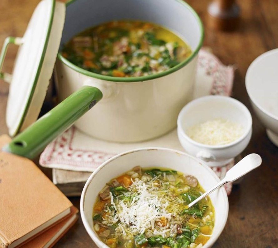200 g slanine 2 čebuli 4 korenčki 3 stebla stebelne zelene 2 stroka česna 1 vejica rožmarina 1 vejica timijana 30 g suhih jurčkov kozarec belega vina 1,5 l piščančje jušne osnove 180 g ješprenjčka šop ohrovtovih listov sol poper parmezan za posip