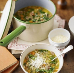 Ohrovtove liste narežemo, jih dodamo v juho in kuhamo 5 do 10 minut. Enolončnico postrežemo s hrustljavim kruhom in parmezanom za posip.
