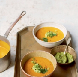 Prilijemo jušno osnovo, zavremo in nežno kuhamo 40 minut, da je korenček zelo mehak. Pustimo, da se malo ohladi, nato juho gladko zmešamo s paličnim mešalnikom ali v multipraktiku. Dodamo limonov sok ter solimo in popramo po okusu. Juho zlijemo nazaj v lonec, dodamo mleko in pogrejemo. Ponudimo jo s salso iz indijskih oreškov in koriandra ter z mlado čebulico, narezano na kolobarčke.