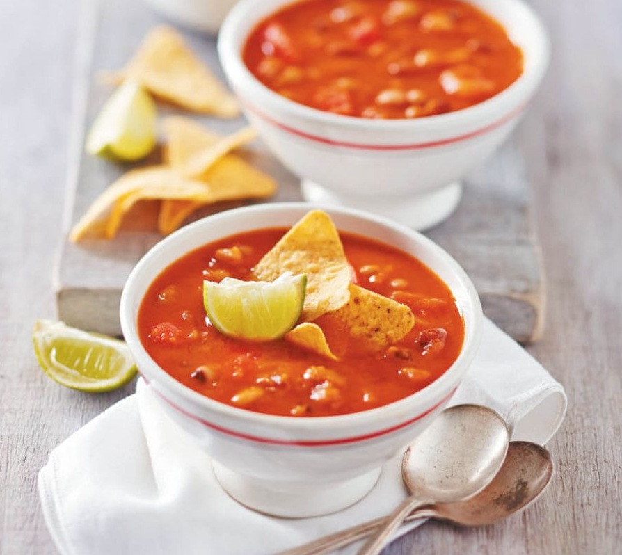 1 žlica oljčnega olja 1 velika čebula 1 strok česna 1 žlica paradižnikove mezge 1 žlička sladkega čilija v prahu ½ žličke mletega kumina (orientalske kumine) 400 g sesekljanega paradižnika iz pločevinke 5 dl zelenjavne jušne osnove 400-gramska pločevinka fižola (lahko mešanega) 1 rdeča paprika tortiljin čips, ko postrežemo 4 limetini krhlji, ko postrežemo