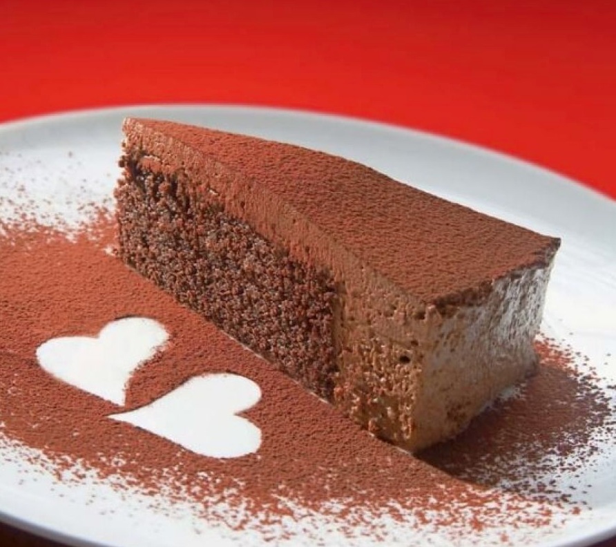 Čokoladno smetano nežno vmešamo v jajčno zmes. Kremo polijemo po biskvitu, površino poravnamo in postavimo za 4 do 5 ur v hladilnik, da se krema utrdi. Torto vzamemo iz modla; če ne gre zlahka, ovijemo model z vročo brisačo in počakamo nekaj minut. Torto potresemo s kakavom in pustimo, da se segreje na sobno temperaturo, preden jo postrežemo.