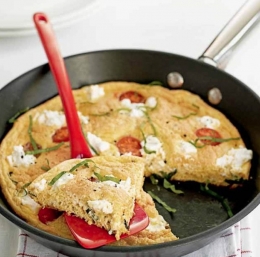 V ponvici segrejemo olje in vanj vlijemo jajčno zmes. Pražimo eno minuto, nato pa jajčno zmes obložimo s kozjim sirom in paradižniki. Ponev za 5 minut postavimo v pečico pod žar, da masa naraste, se utrdi in obarva, vendar je še vedno mehka in nekoliko ma. Penasto omleto potresemo s preostalo baziliko in postrežemo s solato.
