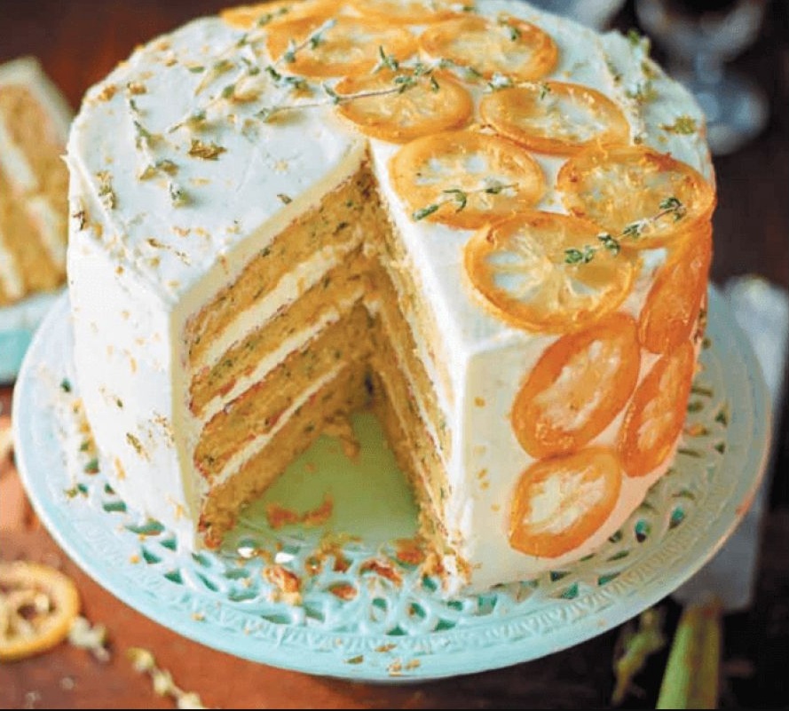 Ohlajeno torto po vseh straneh premažemo z drugo plastjo kreme. Eno stran torte po vrhu obložimo s kandiranimi rezinami limone in vejicami timijana, kot je prikazano na sliki.