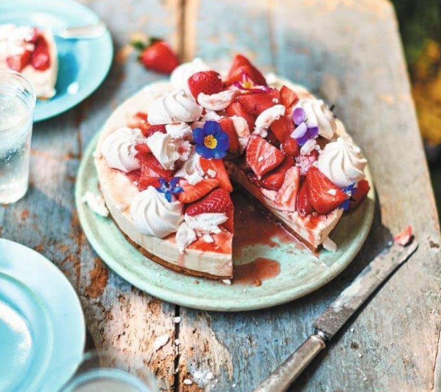 100 g masla in še malo za model 200 g maslenih piškotov 400 g maskarponeja 420 g polnomastnega kremnega sira 150 g sladkorja v prahu + 2 žlici za jagode 1 strok vanilje ščep soli 2,25 dl sladke smetane 600 g jagod 1 žlica balzamičnega kisa 10 majhnih španskih vetrcev užitne cvetlice za okras (po želji)