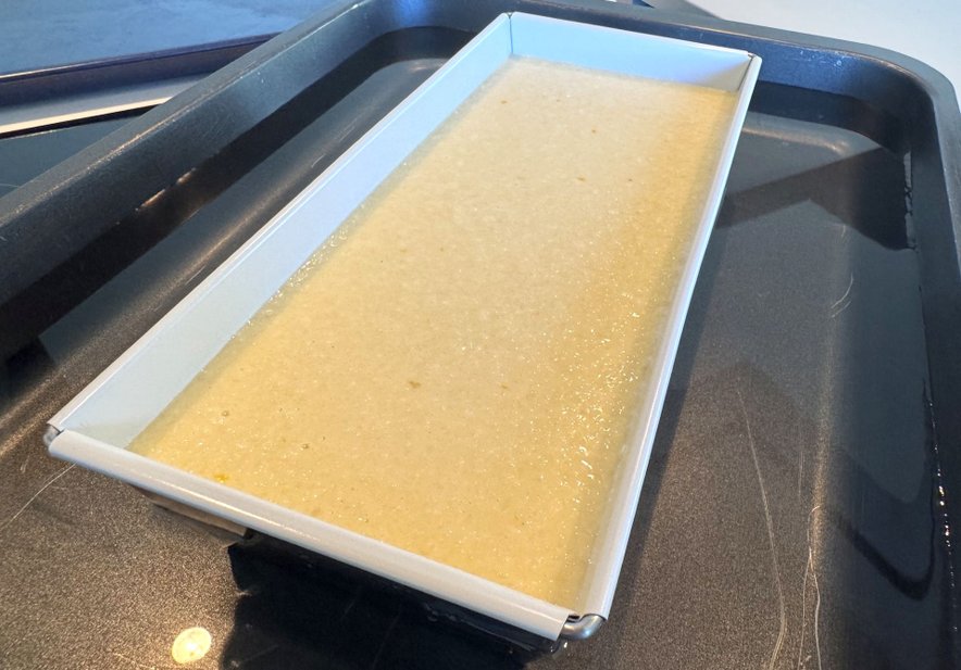 Zmes prelijemo v pekač, ki ga postavimo v večji pekač. Slednjega do polovice napolnimo z vodo.