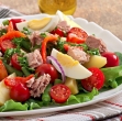 pribl. 450 g kuhanega riža (pribl. 200 g surovega) 200 g tunine iz slanice 100 g zamrznjenega graha 1 rdeča paprika 2 paradižnika 3 mlade čebulice majhen šopek peteršilja pest zelenih oliv brez koščic 2 žlici majoneze sok ½ limone 1 žlica ekstra deviškega oljčnega olja sol poper