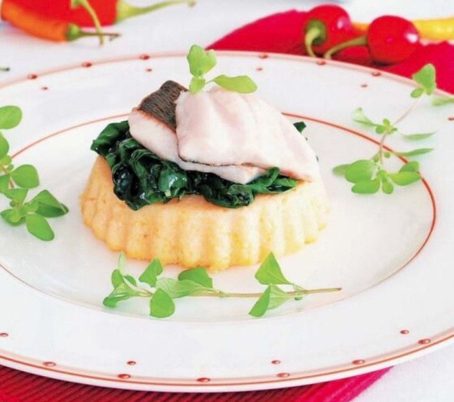 Polento zvrnemo na delovno površino. Z modelčkom izrežemo lepe okrogle rezine, jih serviramo na krožnike, obložimo s špinačo in pečenimi ribjimi fileji ter ponudimo.
