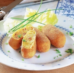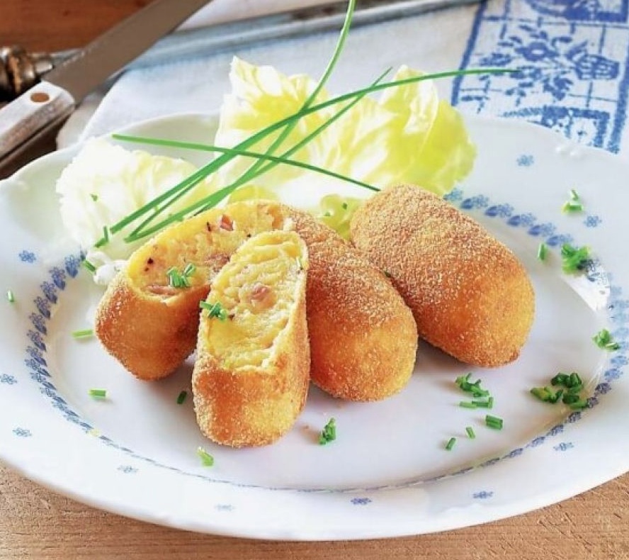 1 kg krompirja 250 g prekajenega mesa (drobne kocke) 250 g moke 2 rumenjaka 60 g masla sol jajce in drobtine za paniranje maščoba za cvrenje