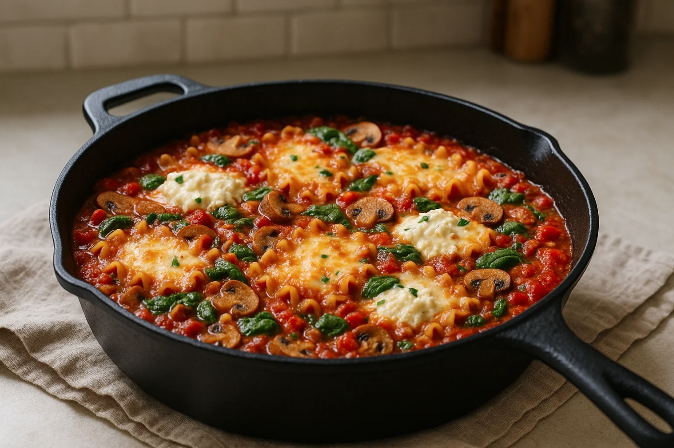 Namesto da bi sestavljali plasti testenin in omake v veliki posodi, tukaj vse pripravimo kar v eni ponvi. To pomeni manj posode za pomivanje in več časa za uživanje. Poleg tega lahko zelenjavo prilagodimo trenutni sezoni – od bučk in špinače do paprik, gob ali celo korenja.