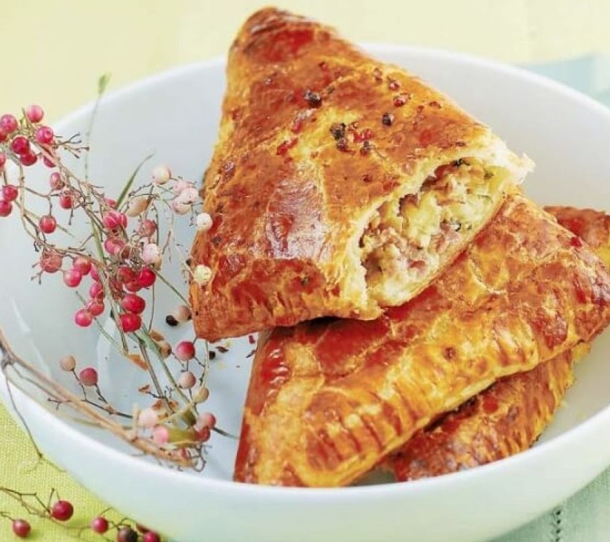 Testo iz vsakega zavojčka najprej pripravimo v skladu z navodilom z embalaže, nato pa razrežemo na 6 kvadratov. Vseh 12 testenih kvadratov namažemo s stepenim jajcem. Po testu porazdelimo nadev in kvadrate preganemo v trikotnike. Nadevane trikotnike ob robu dobro stisnemo z vilicami in premažemo z jajcem. Vogalčke večkrat prebodemo z vilicami, da med peko lahko uhaja zrak.