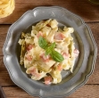 Pečico segrejemo na 170 do 180 °C. Obe smetani damo v primerno posodo in gladko zmešamo, nato pa vmešamo jajce in kosmiče krompirjevega pireja. Dodamo šunko, sir, poper in peteršilj ter vse sestavine dobro premešamo.