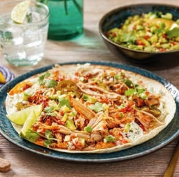 500 g natrgane svinjine koriander 1 čebula 300 g paradižnika 1 avokado limetin sok sol 4 tortilje 125 g svežega sira s čilijem 15 g narezane pekoče paprike (jalapeño) 100 g sira ementalec