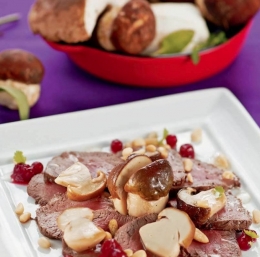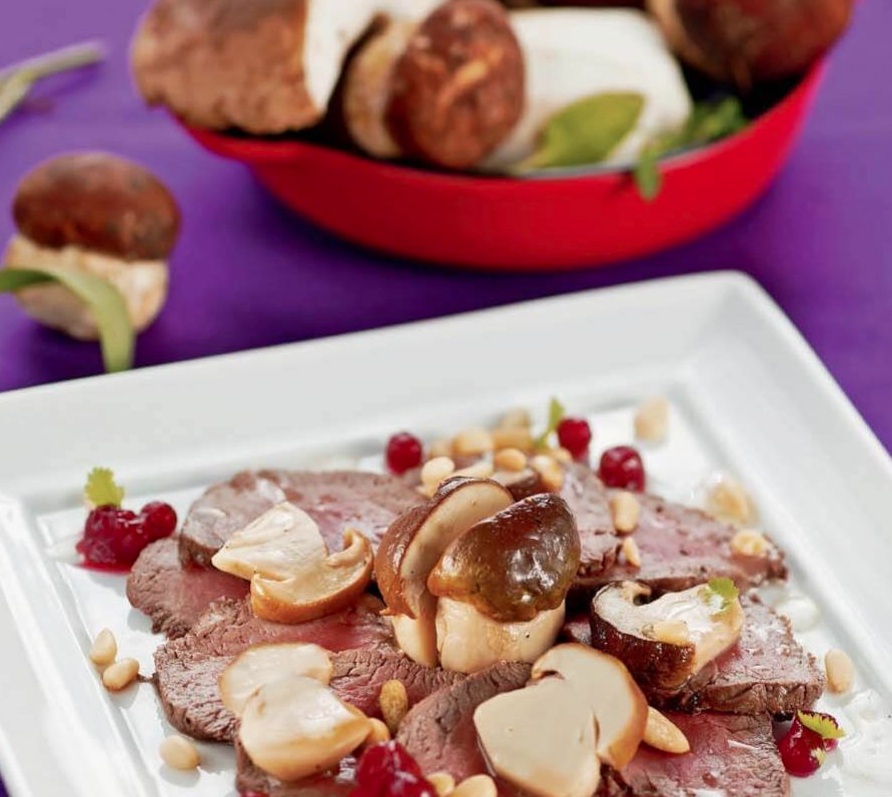 S še toplega mesa odstranimo vrvico in hrbet narežemo na tanke rezine. Srnino serviramo z jurčki in pripravljeno omako, okrasimo s praženimi pinjolami in brusnicami ter ponudimo.
