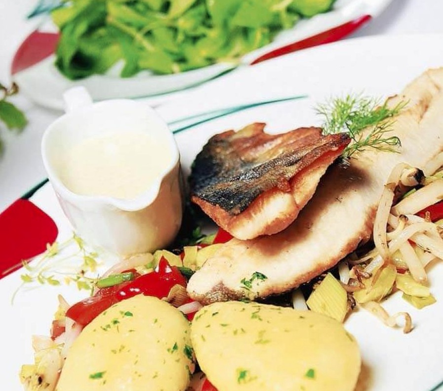 Ribje fileje razporedimo na krožnike in postrežemo z vinsko omako. Zraven tekne hrustljavo pražena zelen, peteršiljev krompir in zelena solata.