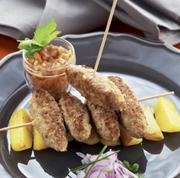 Čevapčiče ponudimo s pečenim krompirjem in pripravljeno zelenjavno salso. Jed okrasimo s čebulnimi kolobarčki.