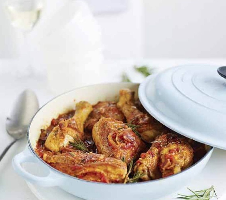 Čebulo olupimo in sesekljamo. Piščanca razkosamo. Piščančje kose solimo. V veliki ponvi segrejemo olje in na njem postopoma, ne preveč kosov naenkrat, opražimo piščančje kose do zlate barve. Pražene odložimo na krožnik, zmanjšamo ogenj in v isti ponvi počasi pražimo slanino, da se izloči maščoba in se slanina hrustljavo speče. Slanino odložimo k mesu in v ponev damo čebulo in rožmarin. Pražimo 10 do 15 minut, da se čebula zmehča, nato v ponev vrnemo piščanca in slanino. Dodamo paradižnik, kis, sladkor in piščančjo osnovo. Solimo in popramo.