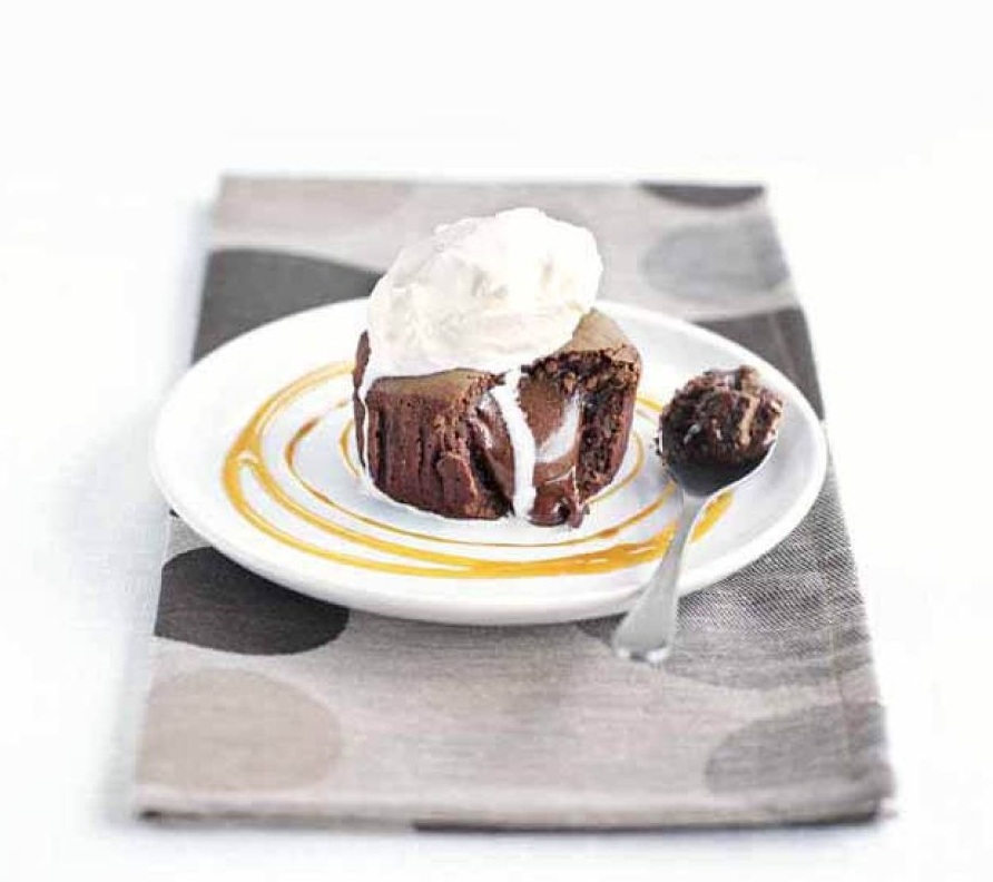 200 g kakovostne temne čokolade, nadrobljene na majhne koščke 200 g masla, narezanega na majhne koščke 200 g svetlo rjavega sladkorja 4 cela jajca 4 rumenjaki 200 g moke 50 g stopljenega masla za modelčke kakav v prahu za modelčke karamelna omaka (glej recept) in vaniljev sladoled ali pomarančni sorbet, ko postrežemo