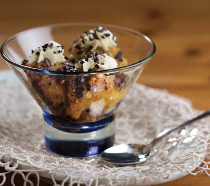 5 rumenjakov 100 g sladkorja 1 žlica masla 80 g sadnih mislijev 0,5 dl mareličnega likerja 2 dl sladke smetane čokoladni ostružki za posip