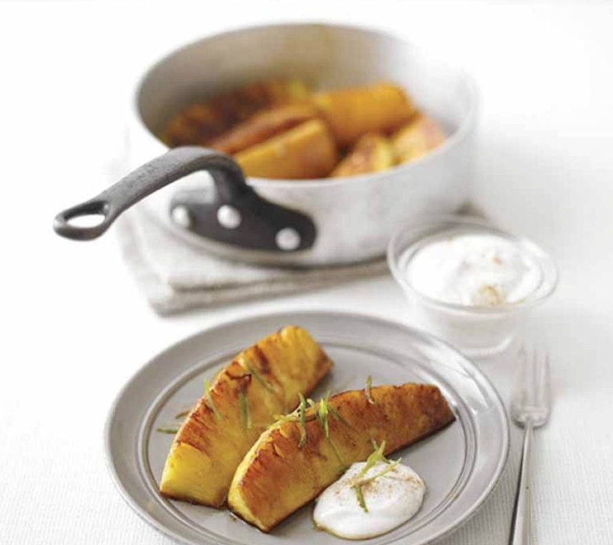 Maslo in drugo žlico medu segrejemo v ponvi, da se maslo stopi. Dodamo ananas in ga na visoki temperaturi ob pogostem obračanju pražimo 8 minut, da se karamelizira. Dolijemo začinjeno limetino omako, zavremo in ananas nekaj sekund obračamo, da se glazira v omaki. Glazirani ananas takoj postrežemo s cimetovo skuto. Jed okrasimo z rezanci preostale limetine lupine.