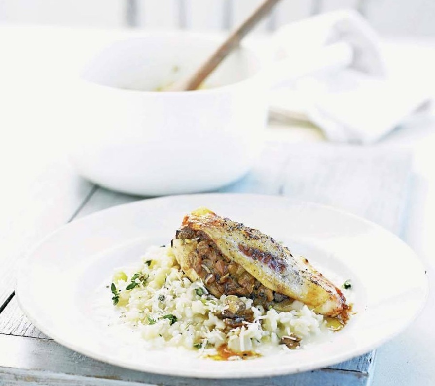 4 kosi piščančjih prsi s kožo 25 g suhih jurčkov 150 g majhnih šampinjonov 2 žlici drobno sesekljane čebule 2 žlici oljčnega olja 2 vejici timijana 1,7 dl belega vina sol poper žlica parmezana za postrežbo rižota 1 žlica masla 1 žlica oljčnega olja 2 stebli drobno narezane stebelne zelene 1 drobno sesekljana majhna čebula 150 g riža za rižoto 6 dl vroče piščančje jušne osnove 2 vejici timijana ali limonskega timijana sok in lupina ½ limone 50 g naribanega parmezana