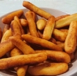 150 g moke in še malo za delovno površino 1 rumenjak 1 žlička zmehčanega masla 0,5 dl sladke smetane 1 žlica ruma sol rastlinsko olje za cvrenje sladkor v prahu za posip