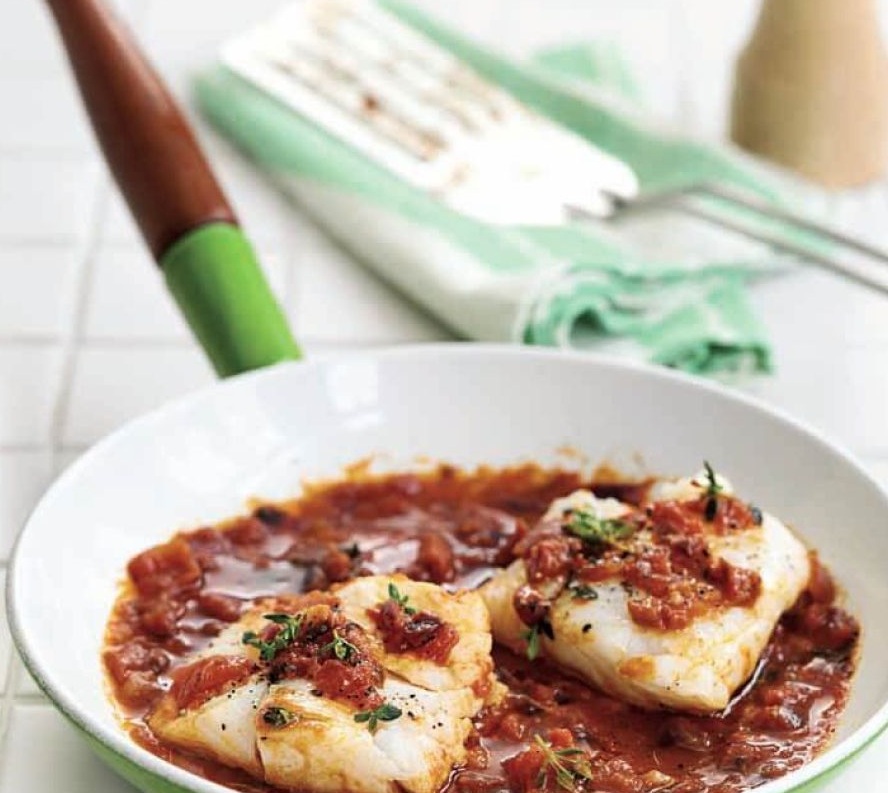 Ogenj zmanjšamo in omako kuhljamo 5 minut, nato ji dodamo še ribje fileje. Ponev pokrijemo in kuhljamo še 8 do 10 minut, da se riba do konca skuha. Postrežemo s pečenim ali v sopari kuhanim krompirjem.