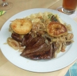 Sestavine 300 g piščančjih jeter 40 g masla 2 čebuli 2 žlici suhega šerija 1 dl piščančje ali zelenjavne jušne osnove sol poper pire z gorčico 450 g olupljenega krompirja ½ dl mleka ½ žlice polnozrnate gorčice 1 žlička dijonske gorčice