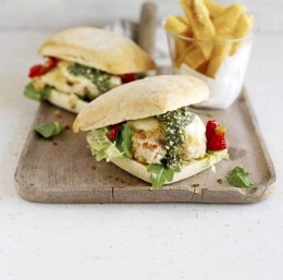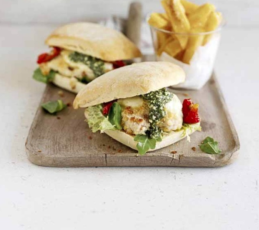 Piščančje prsi razporedimo po drugem pekaču in jih pečemo 10 do 12 minut, da se popolnoma spečejo in postanejo hrustljave. Nato na vsak kos piščanca položimo rezino mocarele in spet postavimo v pečico, da se sir rahlo stopi. Čabate ali kruhke za hamburgerje prerežemo na pol in jih rahlo popečemo. Obložimo jih z nekaj solatnimi listi. Nanje položimo piščančje prsi, jih obložimo s pestom iz bazilike in dodamo še paradižnik. Postrežemo s pomfrijem iz polente.