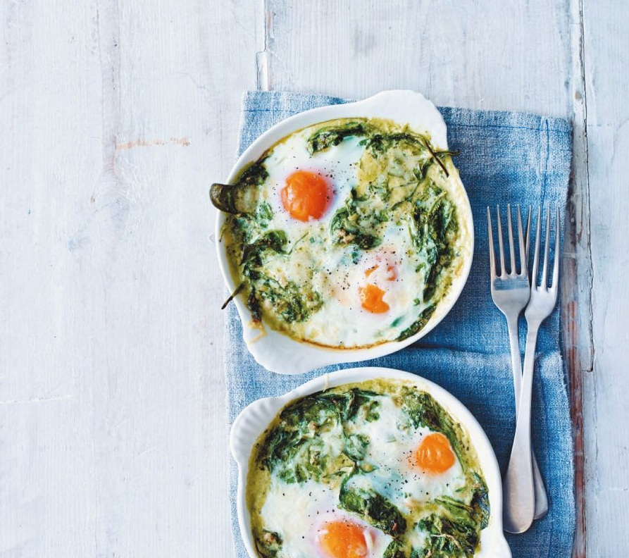 100 g mlade špinače 4 žlice svežega bazilikinega pesta 1 dl sladke smetane sol poper 1 žlica drobno naribanega grojerja ali drugega aromatičnega trdega sira 4 srednje velika jajca