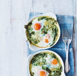 Pečico segrejemo na 200 °C. Špinačo grobo nasekljamo in jo zmešamo s pestom in smetano, solimo in popramo. Mešanico razdelimo v 2 plitvi ognjevarni skledici in posujemo s sirom. V vsaki skledici v špinačo naredimo 2 plitvi vdolbini in vanje ubijemo jajca.
