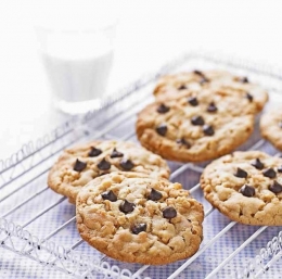 Dodamo moko, sestavine premešamo, nato pa vsujemo v testo še ekspandirani riž. Vmešamo ga v testo in iz testa oblikujemo za oreh velike kroglice. Kroglice z rokami sploščimo in polagamo na pekač, predhodno namazan z malo masla. Piškote okrasimo z nekaj čokoladnimi kapljicami.