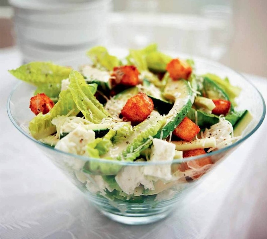 2 rezini belega kruha 1 žlička mlete paprike 2 žlici oljčnega olja 1 strok česna 1 glava hrustljave zelene solate 2 zrela avokada 2 žlici limonovega soka 1 velika bučka 150 g sira feta 25 g naribanega parmezana 6 žlic solatnega preliva (glej nasvet) sol sveže mleti črn poper