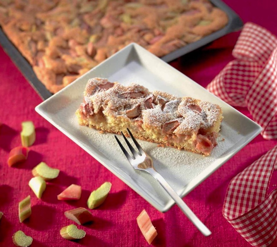Globok pekač namažemo z maslom, potresemo z naribanimi orehi in napolnimo s pripravljeno maso. Površino lepo zgladimo. Po testu porazdelimo koščke rabarbare in pečemo v prej ogreti pečici pri 160 °C približno pol ure. Še topel kolač razrežemo na rezine in ponudimo.